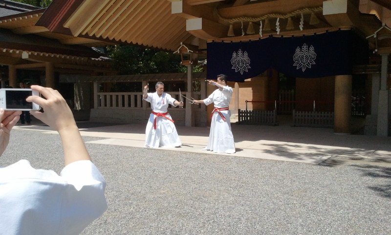 Yondan and more senior students did Sai Kata Ganki Dai. (The folks at Customs got a kick out of my sai, by the way.) And in my gut I like to think that the fact that I did a sai kata on the grounds of the shrine that is the repository of such a sacred sword, somehow charges them up with mana.