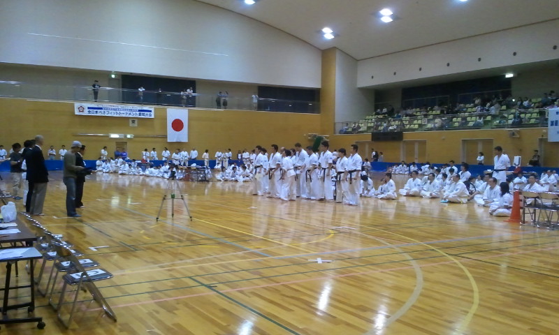 Sunday, the tournament. Yondan students were not eligible to compete, so I was a judge. (And as I was still pretty exhausted maybe it was best that I didn't compete.) I ended up as chief judge for junior brown and yellow belt kata divisions, and with a bit of help on translation I think things went smoothly. (It occurs to me that sometimes you have to give someone some help before they're able to help you or others, a thought worth further exploration.) I also helped judge shodan men's kata (saw a lot of Seienchin!) and was a kumite corner judge for junior green belt boys, lightweight (I think, the weight classes are a little different) black belt men, and junior black belt girls. Everyone showed strong spirit and good sportsmanship. Especially moving was a mildly handicapped shodan who competed in kata. I believe that the young yellow belt I'd seen at Atsuta Shrine also competed. They were wonderful reminders that the purpose of these tournaments is to help push each of us to be our best.