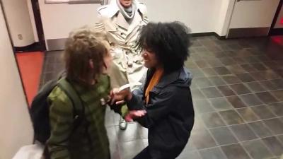 Note at the start of the video, she asks her male friend if he has scissors, a clear threat to forcibly cut his hair -- shades of 1960s right-wingers assaulting hippies. He tries to leave, she grabs him and pulls him down the stairs.