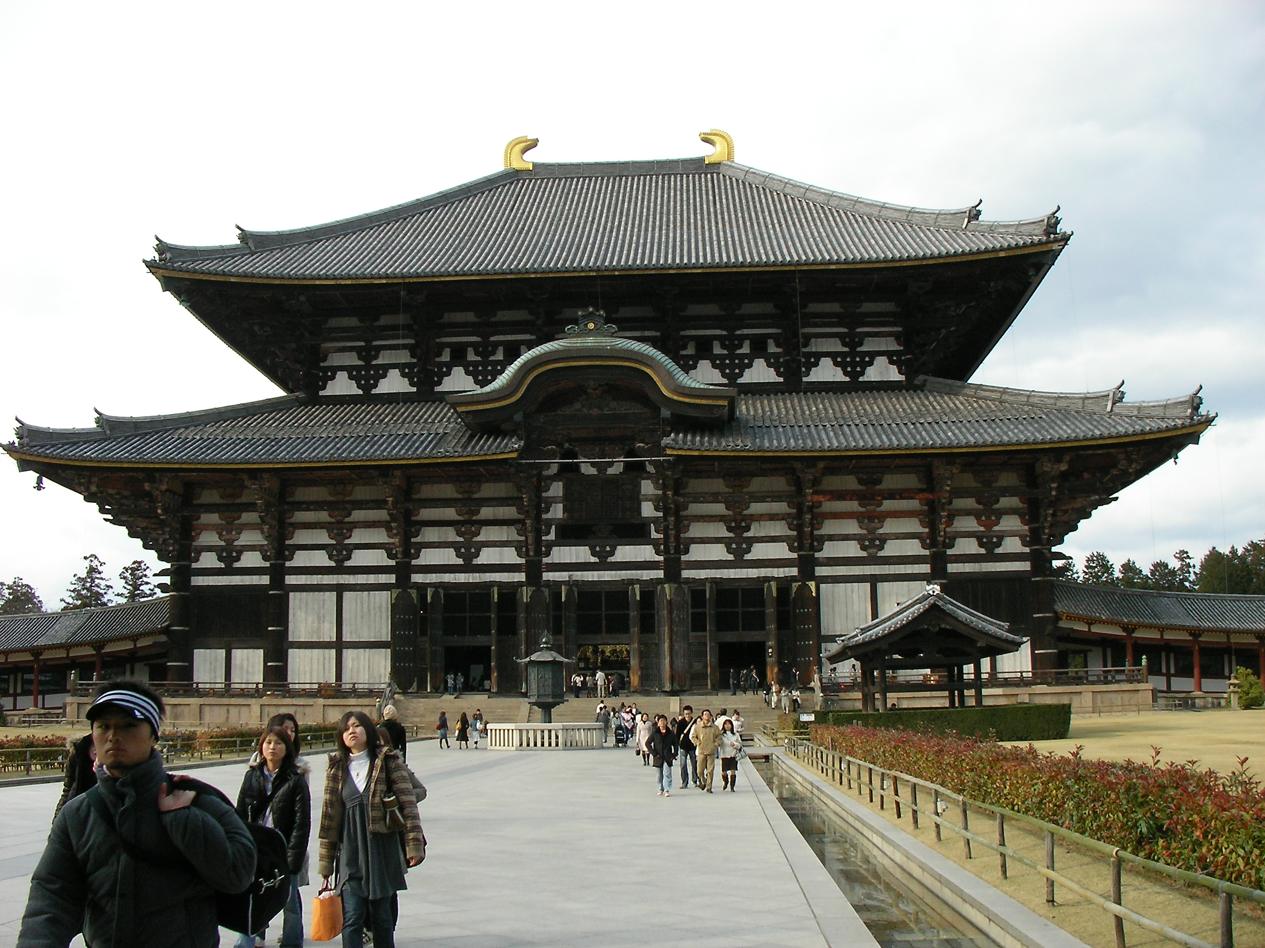 This main hall at Todaiji is home of the Daibutsu, the largest bronze Buddha statue in the world. The building is the largest wooden one in the world, almost 160 feet high and 187 feet long. (And this one is only two-thirds the size of the original; it was rebuilt in 1692 after fire destroyed the old one.)