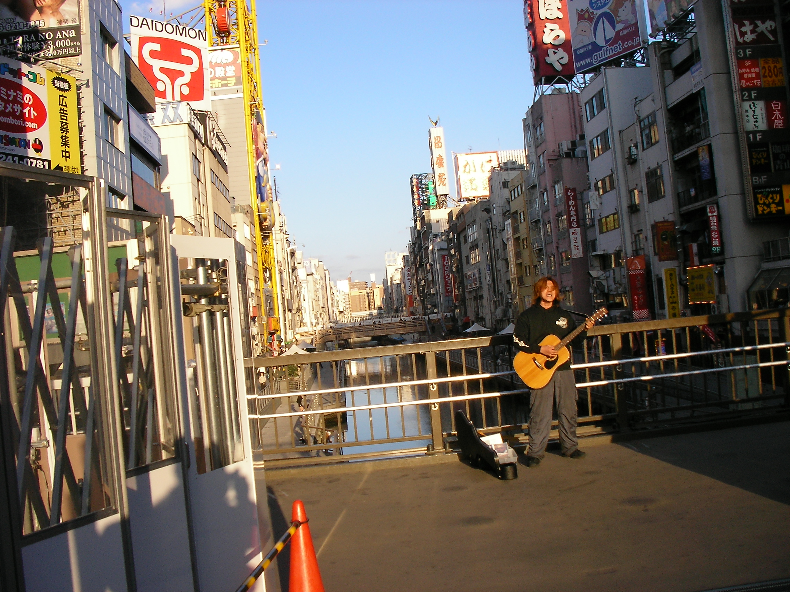 Dude took advantage of construction on the bridge to find a spot near, but just out of, a tremendous pedestrian flow. Didn't see him make any money in the few minutes I watched, but he seemed to be having fun. He was singing in Japanese, I have no idea about what.