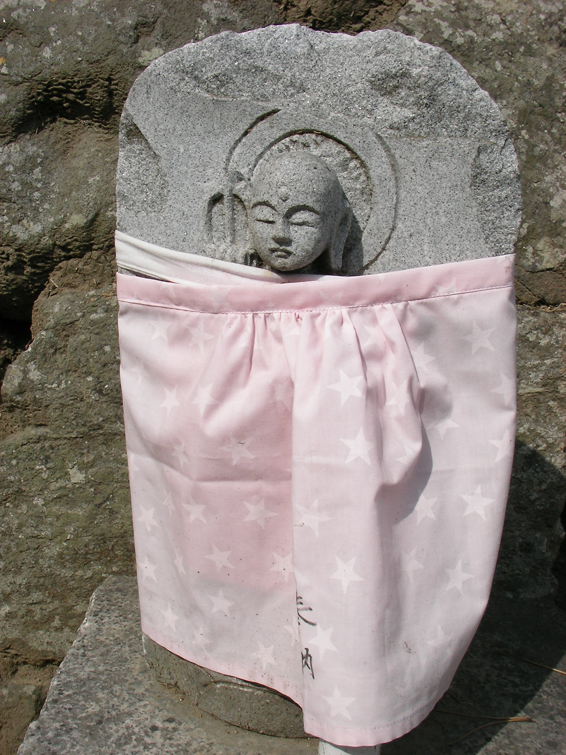 Dressed Jizo statue. There is a tradition of dressing statues of Jizo Bodhisatva (patron of lost children) in bibs or other clothing.