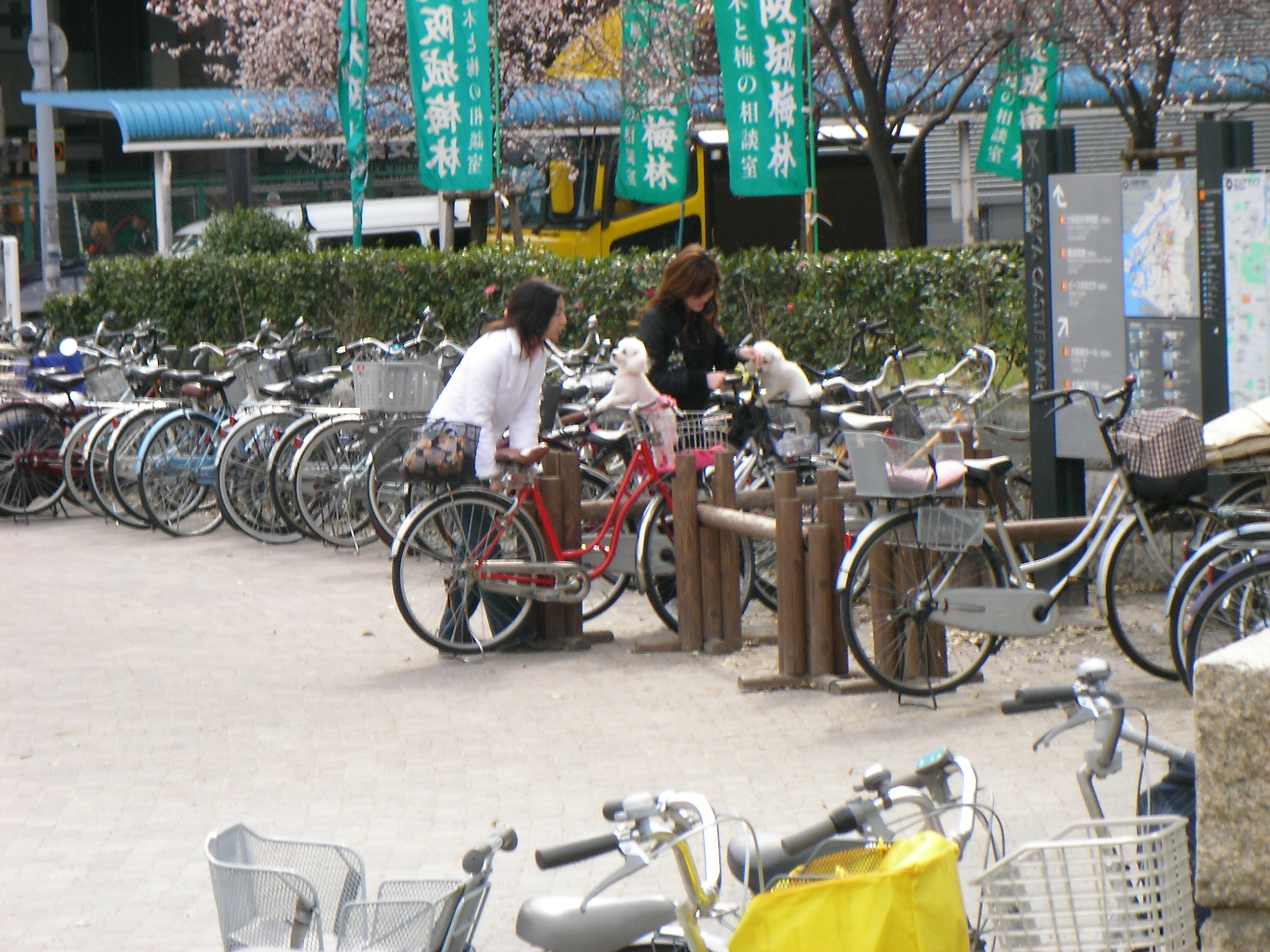 In Osaka Castle park, two young ladies with matching small dogs in bike baskets
