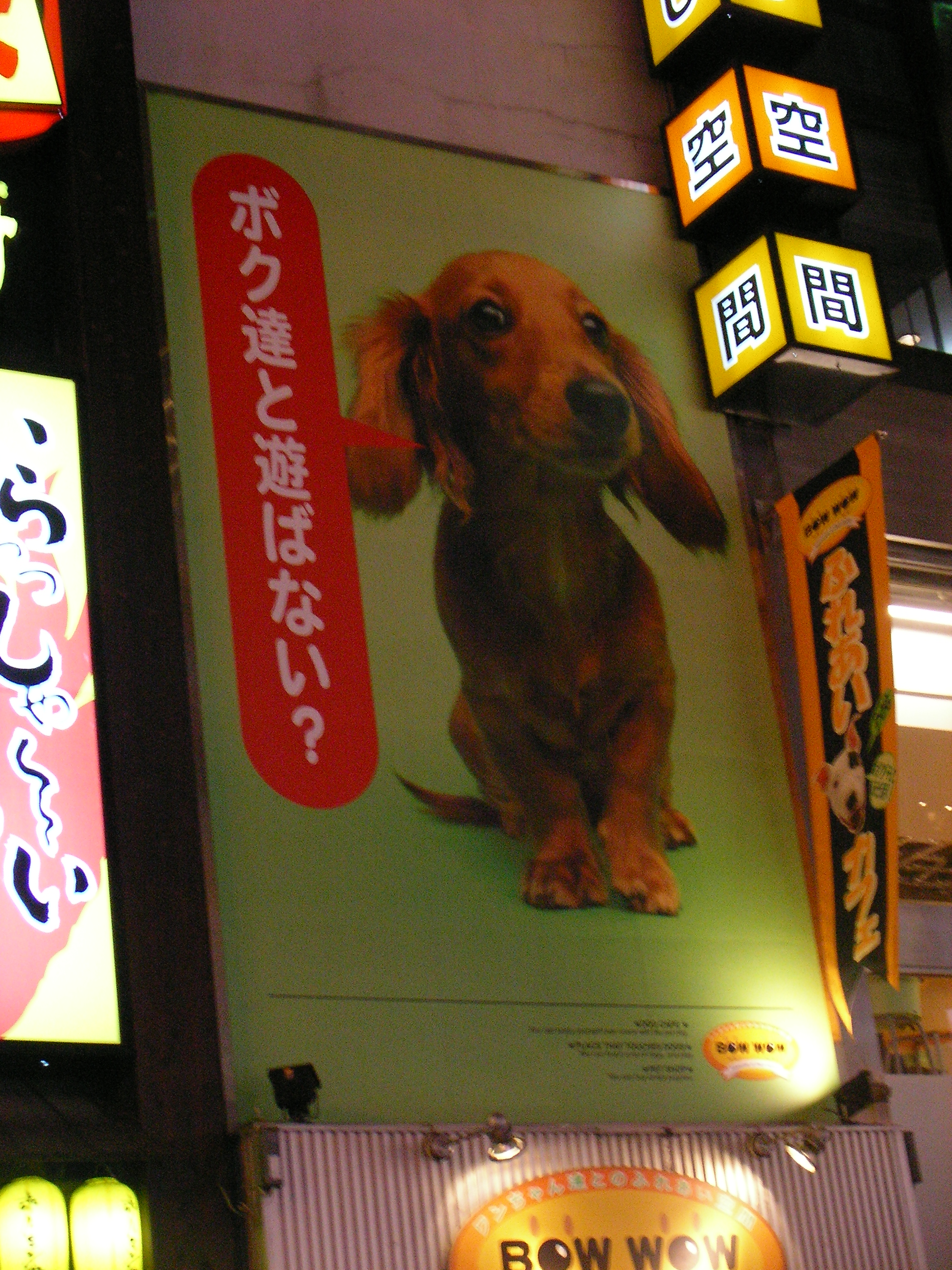 In Shinsaibashi, unfortunately the text on the sign - "Place That Touches Dogs" - didn't come out. Apparently a "dog cafe", where you can take your inu or play with the locals.