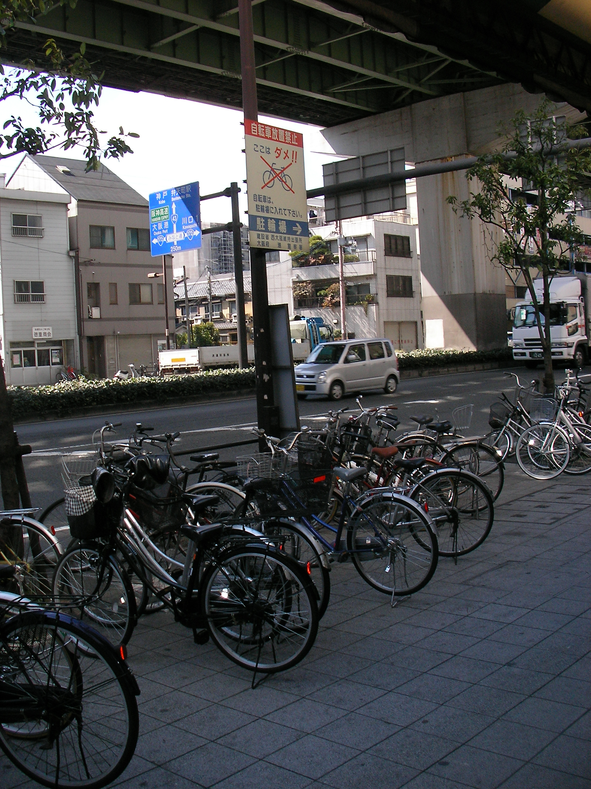 The people of Osaka are notorious scofflaws. Not only do the park their bikes in spaces clearly marked "no bicycles", as seen here; they also cross streets against the light. This is the street outside my apartment building.