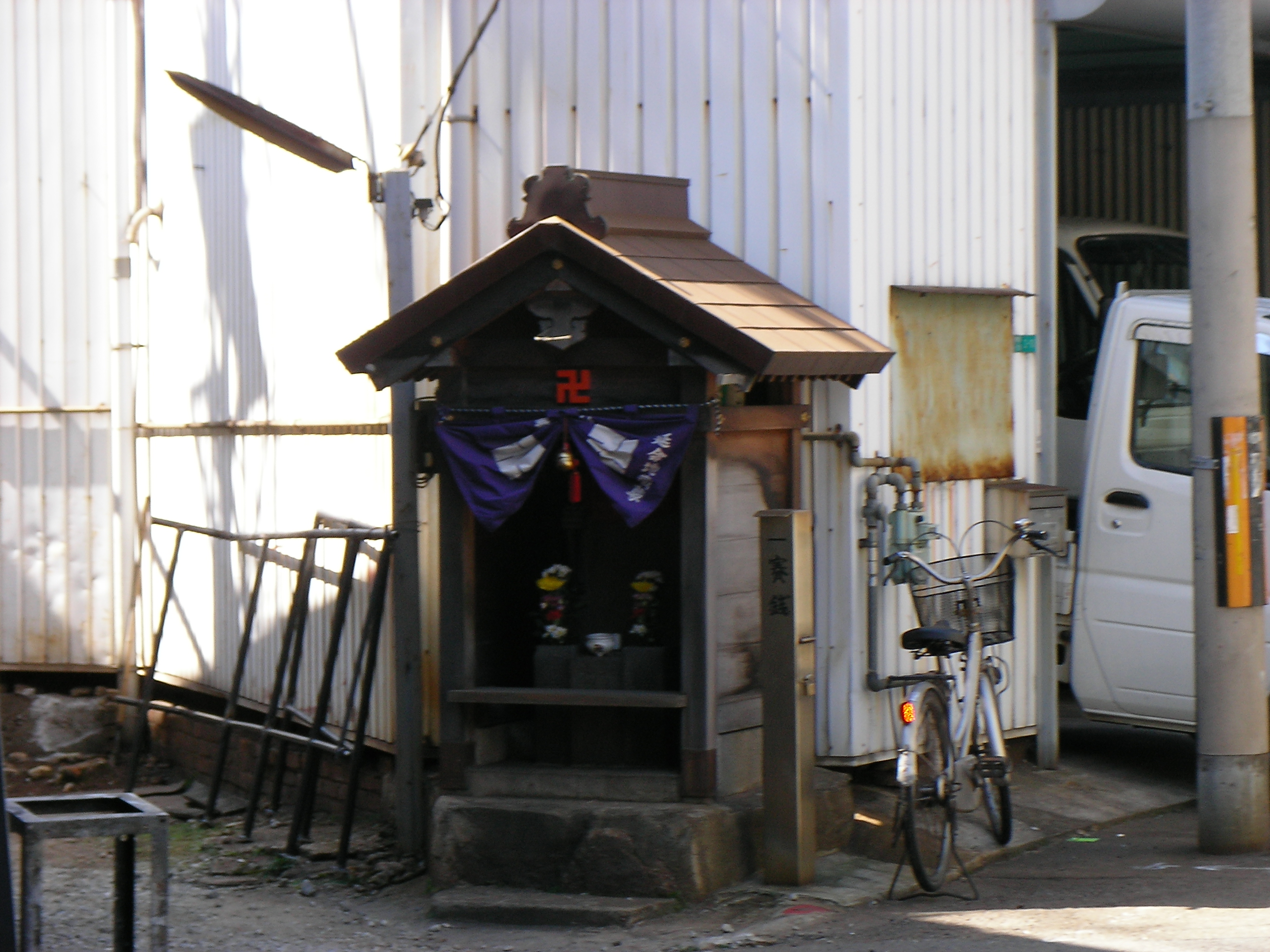 A small Shinto shrine, on a side street in my neighborhood. Right outside some sort of metal-working shop, there was a guy there with a welding torch.